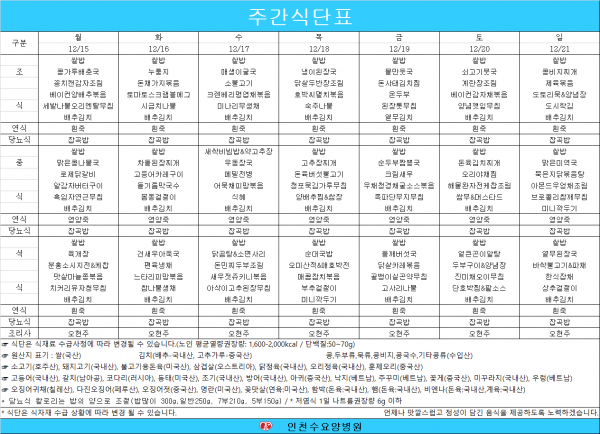 2025년 12월 셋째주 식단표 페이지 정보 작성자 최고관리자 댓글 0건 조회 73회 작성일 25-12-15 11:00 목록 본문 2025년 12월 셋째주 식단표입니다. 이전글2025년 12월 넷째주 식단표 25.12.22 다음글2025년 12월 둘째주 식단표 25.12.08 댓글 0 댓글목록 등록된 댓글이 없습니다.