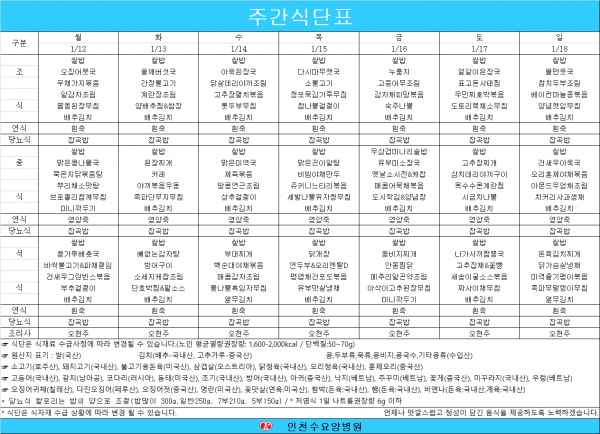 2026년 01월 셋째주 식단표 페이지 정보 작성자 최고관리자 댓글 0건 조회 51회 작성일 26-01-12 13:49 목록 본문 2026년 01월 셋째주 식단표입니다. 이전글2026년 01월 넷째주 식단표 26.01.19 다음글2026년 1월 둘째주 식단표 26.01.05 댓글 0 댓글목록 등록된 댓글이 없습니다.