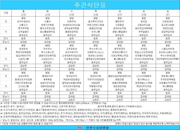 2026년 02월 넷째 주 식단표 페이지 정보 작성자 최고관리자 댓글 0건 조회 13회 작성일 26-02-24 09:52 목록 본문 2026년 02월 넷째 주 식단표입니다. 이전글2026년 03월 첫째주 식단표 26.02.24 다음글2026년 02월 셋째주 식단표 26.02.13 댓글 0 댓글목록 등록된 댓글이 없습니다.